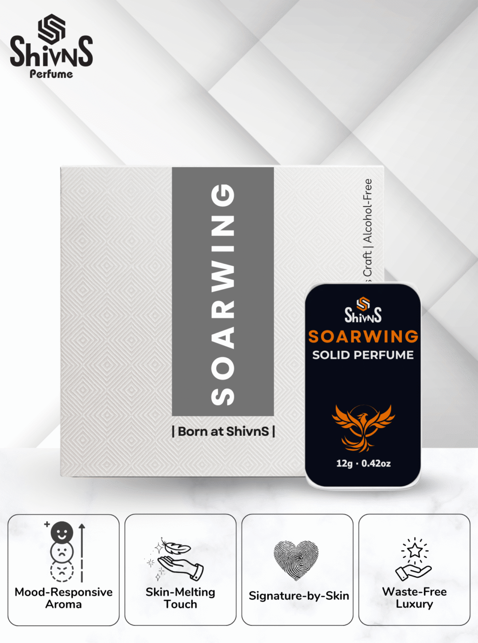 Soarwing Solid Perfume by Shivns: Elegance in Flight. This vibrant fragrance is a soaring blend of fresh citrus and exotic spice—designed for those who embrace freedom and carry a spirit of effortless grace.