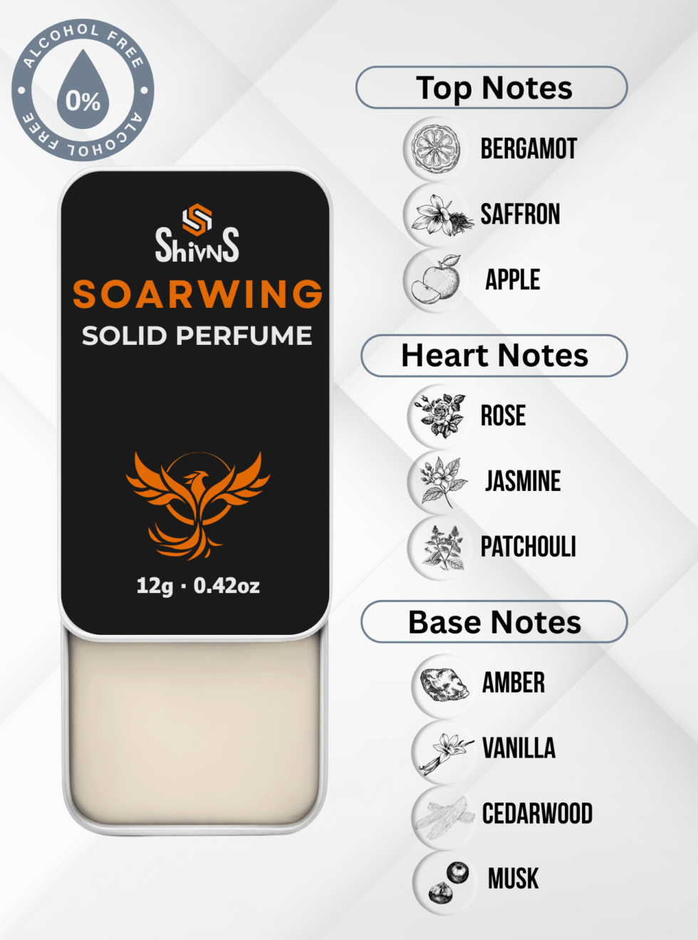 Soarwing Solid Perfume offers an intimate, skin-first fragrance experience. Our signature alcohol-free formula is crafted with a luxurious blend of Shea and Kokum butter, ensuring the balm melts into your skin without any greasy residue. This unique delivery system allows the zesty Bergamot and warm Saffron to evolve slowly with your body heat, creating a rich, floral-woody aura that lasts up to 10 hours.